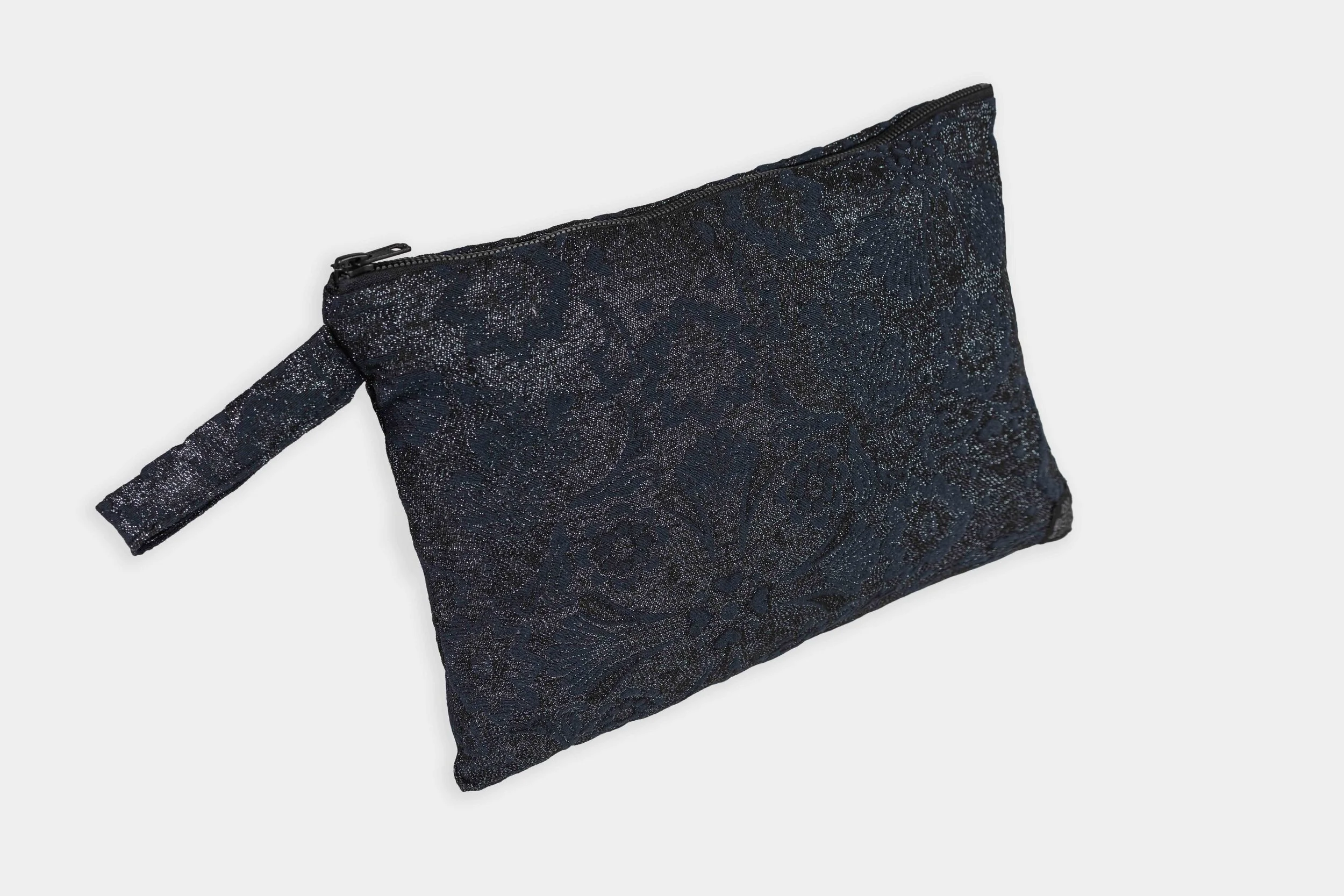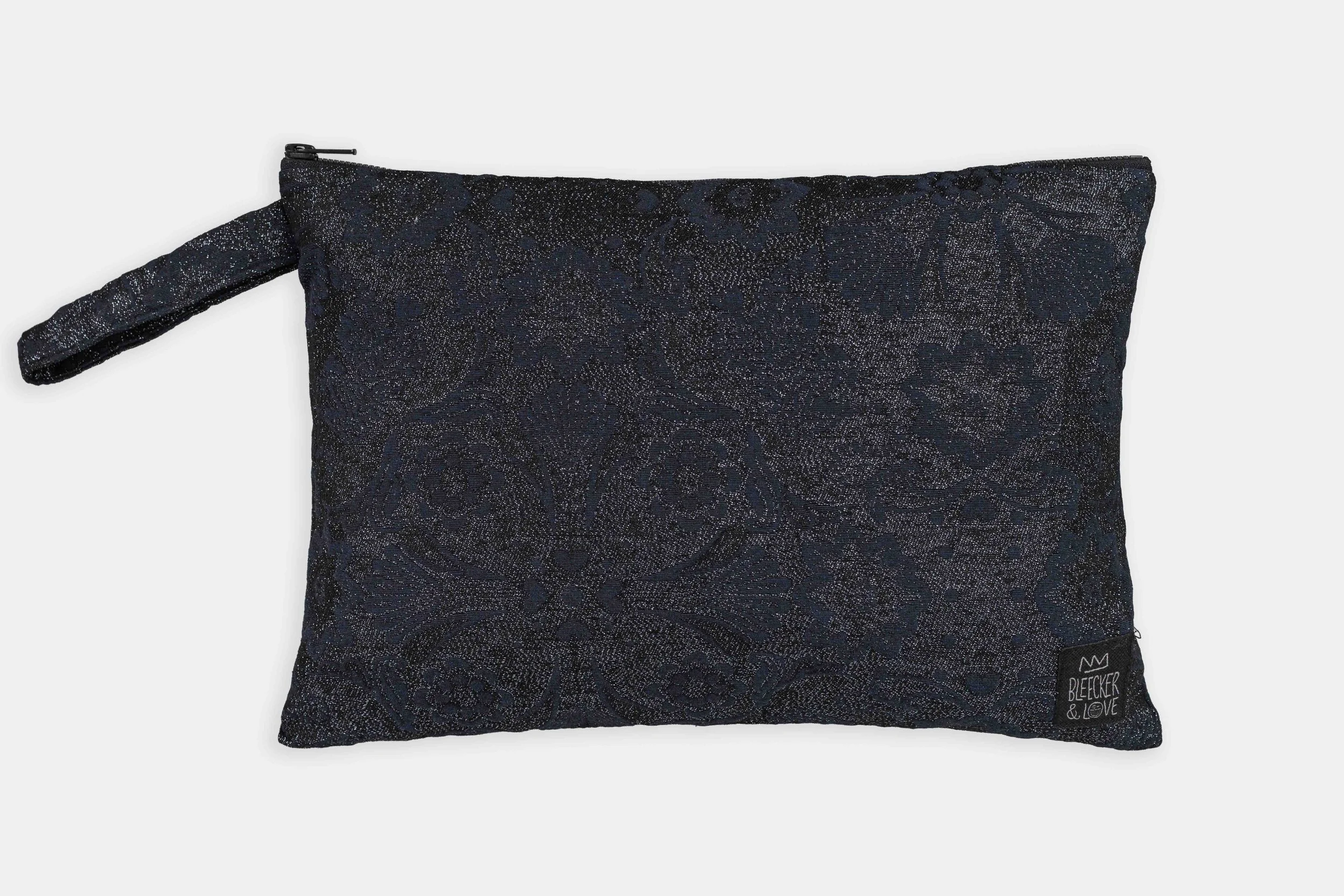 Material: Woven textile with ⋆ metallic ⋆ threads, waterproof lining, YKK zipper closure